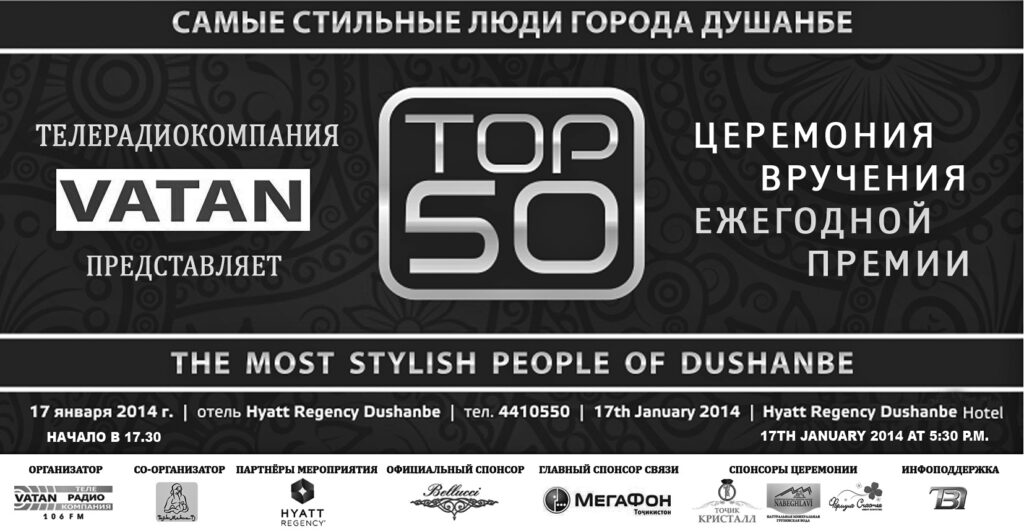 Напомним, организатором церемонии «ТОП-50: самые стильные люди г.Душанбе» является ТРК «Ватан», соорганизатор — сайт www.tajikmama.tj, партнёры мероприятия: отель Hyatt Regency Dushanbe, официальный спонсор — ресторан «Bellucci», главный спонсор связи — компания «МегаФон Таджикистан», спонсоры церемонии: компания «Таджик Кристалл», страховая компания «Итминон», ивент-агентство «Формула счастья». Информационная поддержка: ТВ «Пойтахт», медиа-холдинг «Чархи гардун», медиа-холдинг «Оила», газеты: «Фараж», «Нигох», «Вечёрка», журналы «Элита» и «Reklama&Ideas»