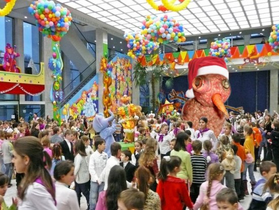 Дети вместе с сказочными персонажами собираются у новогодней елки, рассказывают стихи поют песни. После школьникам показывают спектакли: «Белоснежка и семь гномов», а также «Волшебная свирель», «Бременские музыканты», «Хрустальный башмачок» (или «Золушка»).