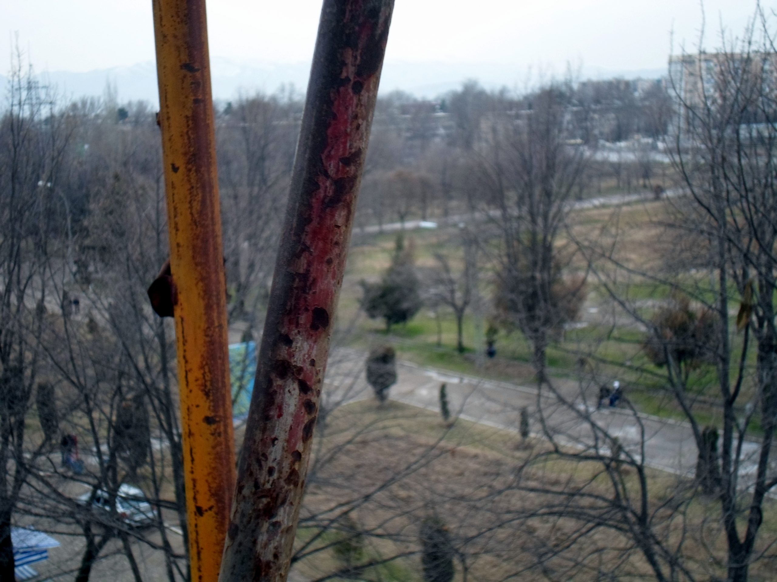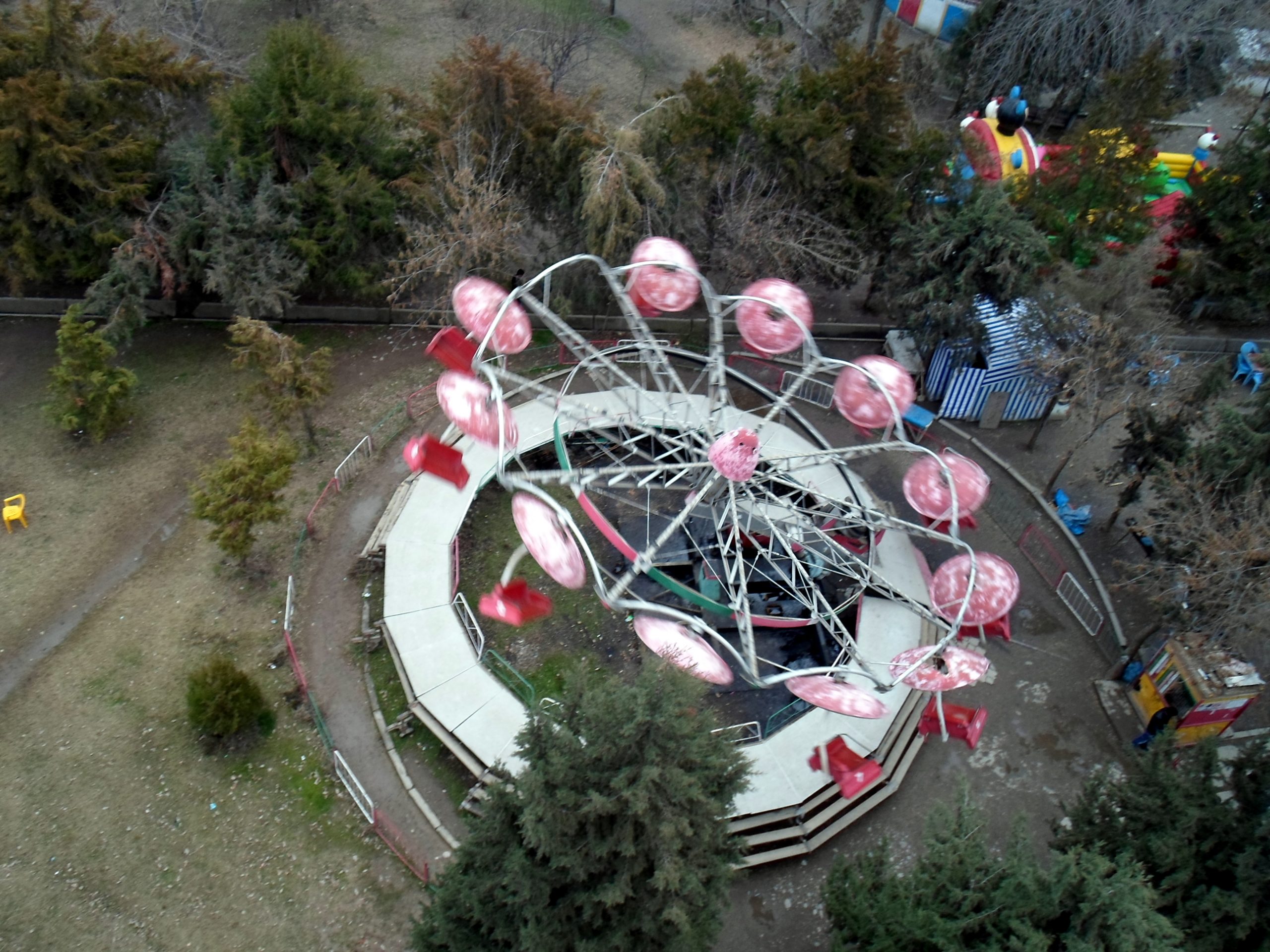 Самый крупный аттракцион парка — «Колесо обозрения», которое движется с трудом. Чтобы сесть в кабину, приходится «запрыгивать» в аттракцион на ходу. В течение всего времени находиться в кабине страшновато: слышно, как она скрипит, внутри кабинок полно мусора, сиденья ободранные. При выходе тоже приходится «выпрыгивать» с кабинки.