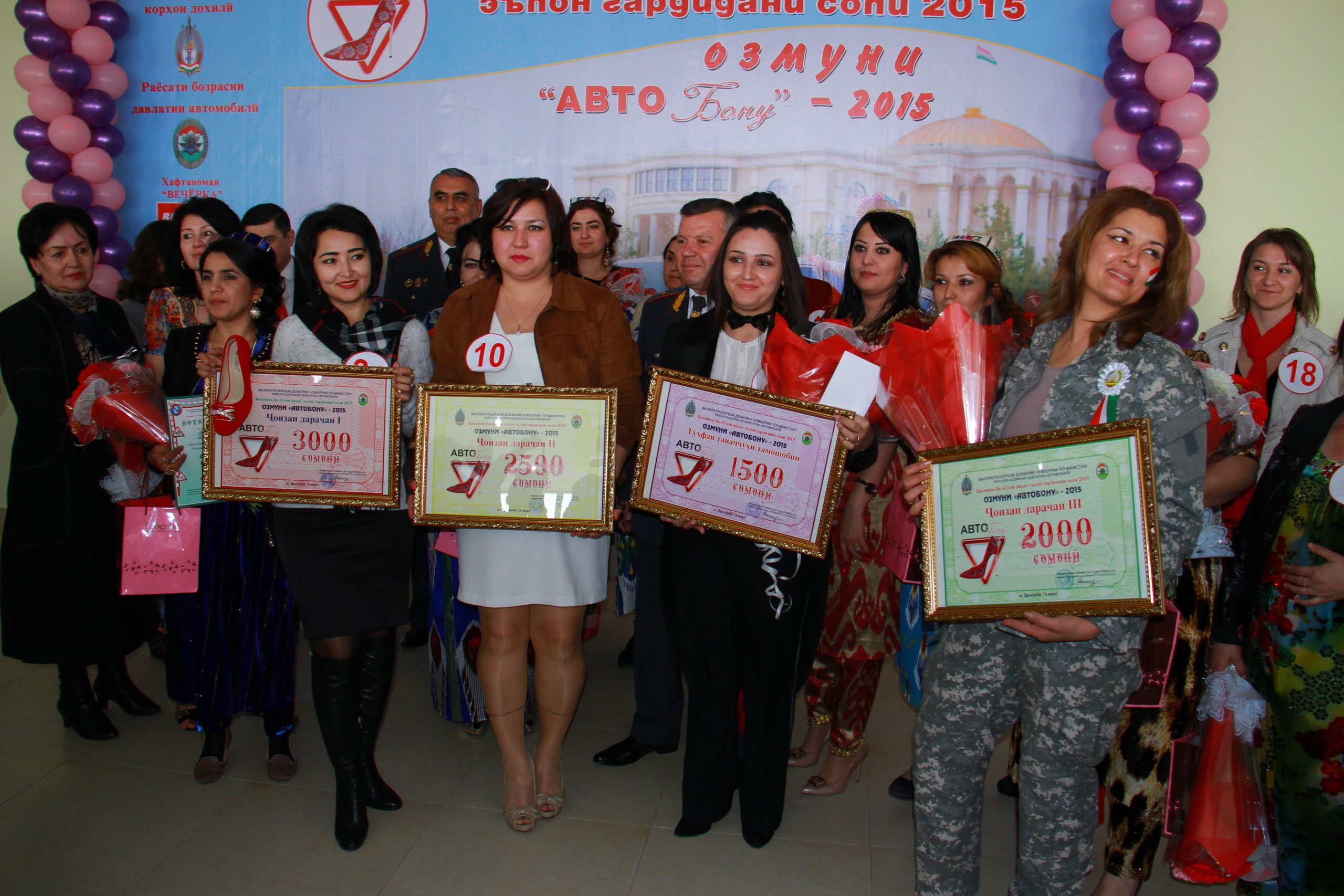 Одной участнице машину подарил свёкор – раз подарил, значит, достойная невестка. А у нескольких парк авто был даже с выбором. Самой молодой участницей оказалась Хумайро Ёрова — №12, а самой опытной, со стажем вождения более 30 лет, оказалась водитель «Старекса», работающая на линии маршрута №52 — Шарифамох Алиева — №15, им на церемонии награждения были вручены именные часы от министра внутренних дел РТ Рамазона Рахимзода.