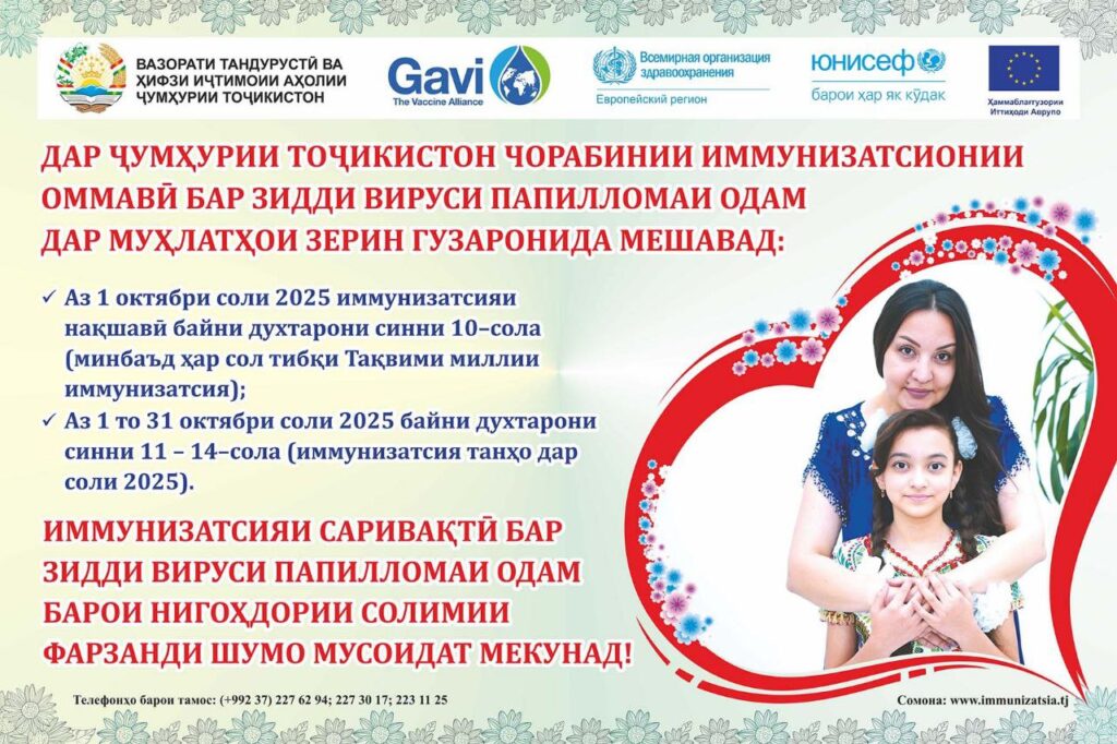 Тибқи қарори Ҳукумати Ҷумҳурии Тоҷикистон “Дар бораи гузаронидани чорабинии иммунизатсионии оммавӣ бар зидди вируси папилломаи одам дар Ҷумҳурии Тоҷикистон”, аз 1 октябри соли 2025 иммунизатсияи нақшавии духтарони 10-сола бо ваксинаи зидди вируси папилломаи одам ба таври доимӣ ба роҳ монда мешавад. Ҳамчунин аз 1 то 30 октябри соли 2025 чорабинии иммунизатсионии оммавӣ бар зидди вируси папилломаи одам дар Ҷумҳурии Тоҷикистон байни духтарони 11-14-сола гузаронида мешавад.
