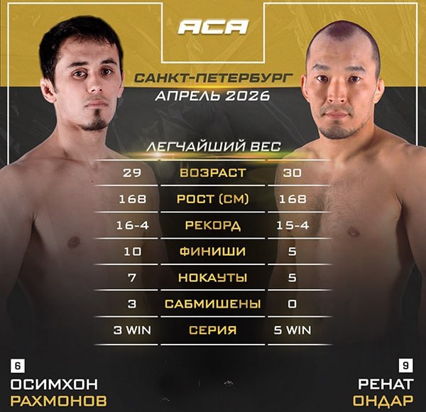Таджикский боец смешанных единоборств Осимхон Рахмонов встретится с россиянином Ренатом Ондаром в претендентском поединке лиги ACA. Бой запланирован на апрель 2026 года в Санкт-Петербурге.