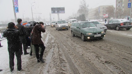 Сейчас столбик термометра показывает — 10 градусов по Цельсию. Столичные дороги заметены снегом, и как всегда ощущается острая нехватка общественного транспорта.