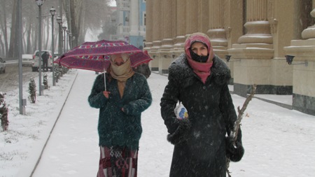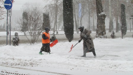 Прошла машина с песком и по пр. С. Шерози, два парня лопатами сбрасывали песок прямо на проезжую часть дороги. Мост через реку очищала бригада женщин-дворников, но это не помогало, тротуар засыпало снегом почти до колена. А в жилых кварталах не убирал никто, поэтому уже к полудню здесь трудно было пройти и даже проехать на машине.