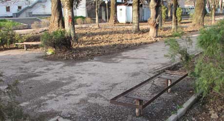 Нельзя сказать, что работы здесь вообще не велись. Видно, что не так давно здесь поработали дворники, причём много и усиленно. Пройдясь по всему периметру парка, замечаешь, что все клумбы и газоны вскопаны, деревья подстрижены, убраны опасные ветки. Радует самая большая местная клумба, разрыхлённая так, как будто на неё приземлялись инопланетяне и оставили замысловатые узоры. Будем надеяться, что дворники посадят здесь не просто колючки, а нечто красивое.